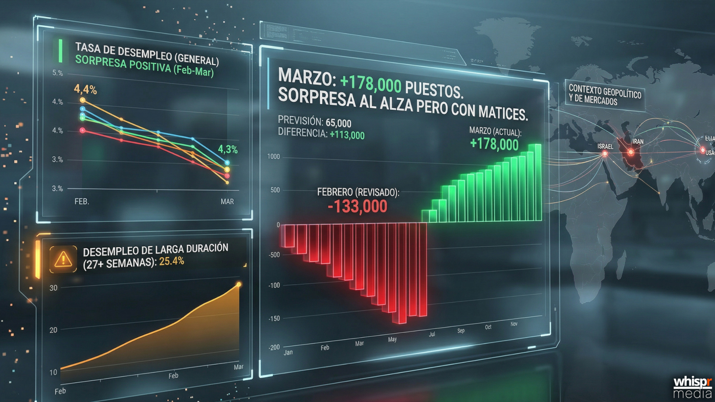 En ese sentido, el reporte de marzo ofrece un alivio parcial. La cifra principal fue claramente mejor que la proyectada y rompe con el pesimismo que había generado el dato previo. Aun así, la revisión negativa de febrero y el aumento del desempleo de larga duración impiden una lectura totalmente optimista.